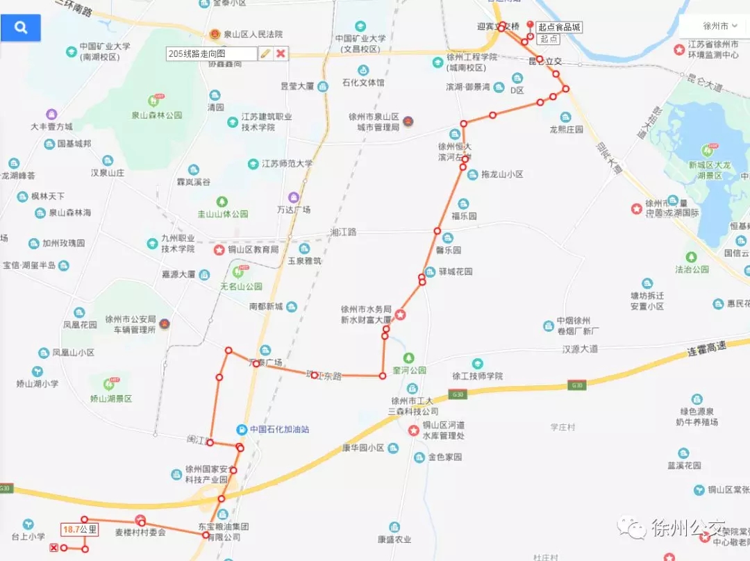為滿足廣大市民出行需求,進(jìn)一步擴(kuò)大徐州高新區(qū)和市區(qū)的交通線網(wǎng),促進(jìn)區(qū)域交通和諧發(fā)展,為更多的市民提供便捷的城市客運(yùn)服務(wù),徐州公交開通了205路線,并于12月18日上午8:30分開始試運(yùn)行。具體線路走向及停靠站點(diǎn)如下: