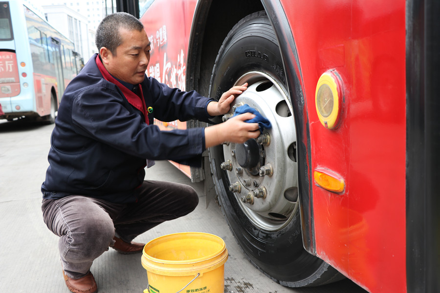 85路線經(jīng)過礦區(qū)路況差,一趟車下來車就很臟了,黨員祁保華把勞動當成一種樂趣,只要車輛停下來,他就會拿起刷子,把車身從前到后刷上一遍,再用抹布細細擦,輪胎更是一趟一擦,一天8個來回,他就要擦8遍輪胎。晚上在文化宮跑夜班,都晚上9點了,他還借著微弱的路燈,里里外外把車打掃干凈。在他的帶動下,85路線駕駛員由觀望到比賽,都成了車輛保潔的好手。
