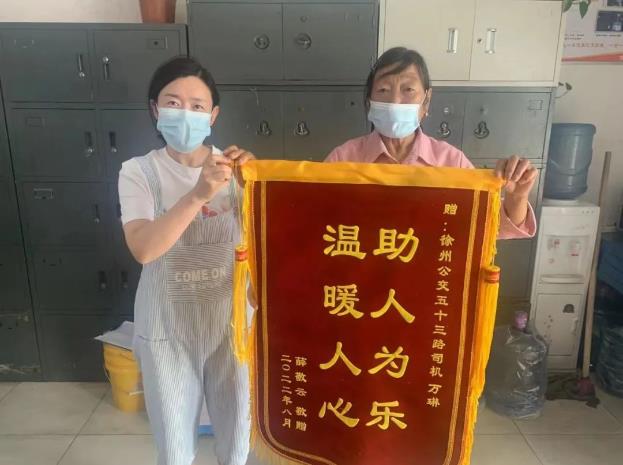 8月28日上午,乘客薛女士手拿著一面印有“助人為樂 溫暖人心”的錦旗來到食品城調度室,感謝53路駕駛員萬琳。