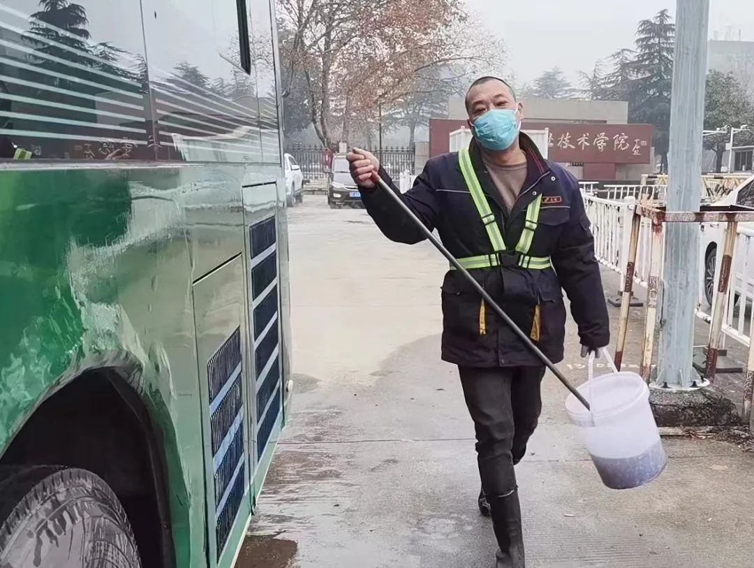 春運(yùn)期間,為保障廣大市民乘客出行需求,部分公交線路縮短了發(fā)車時(shí)間,增加了運(yùn)營(yíng)車輛,再加上客流增多,面擁堵等情況,公交車回到終點(diǎn)站停放的時(shí)間很短,又要投入到下一趟的運(yùn)營(yíng)當(dāng)中,這無(wú)疑給車輛保潔工作帶來(lái)了一定的困難。因此,為確保出場(chǎng)車輛干凈整潔,每天天沒(méi)亮,張璞已經(jīng)在建筑學(xué)院停車場(chǎng)里忙起來(lái)了。只見(jiàn)他一手拿毛刷,一手拎水桶,開(kāi)始清潔車廂外部,張璞動(dòng)作嫻熟地擦拭前擋風(fēng)玻璃、車廂外部?jī)蓚?cè),不一會(huì),他的臉上就已掛滿了汗珠,平均一輛車10分鐘的清潔時(shí)間,是他十多年工作鍛煉出來(lái)的速度。近日氣溫驟降,持續(xù)有冰凍天氣,如果抹布太濕,早晨擦座椅時(shí)會(huì)粘在上面,為張璞都會(huì)提前準(zhǔn)備好潮濕的抹布,既能擦掉扶手、座椅、靠背上的浮塵,還不會(huì)留下水漬。像這樣日復(fù)一日的簡(jiǎn)單工作,張璞堅(jiān)持了十多年,他平均每天要打掃23臺(tái)車,平均一輛車10分鐘的清潔時(shí)間,張璞用自己的勞動(dòng),換來(lái)了車輛的干凈整潔。