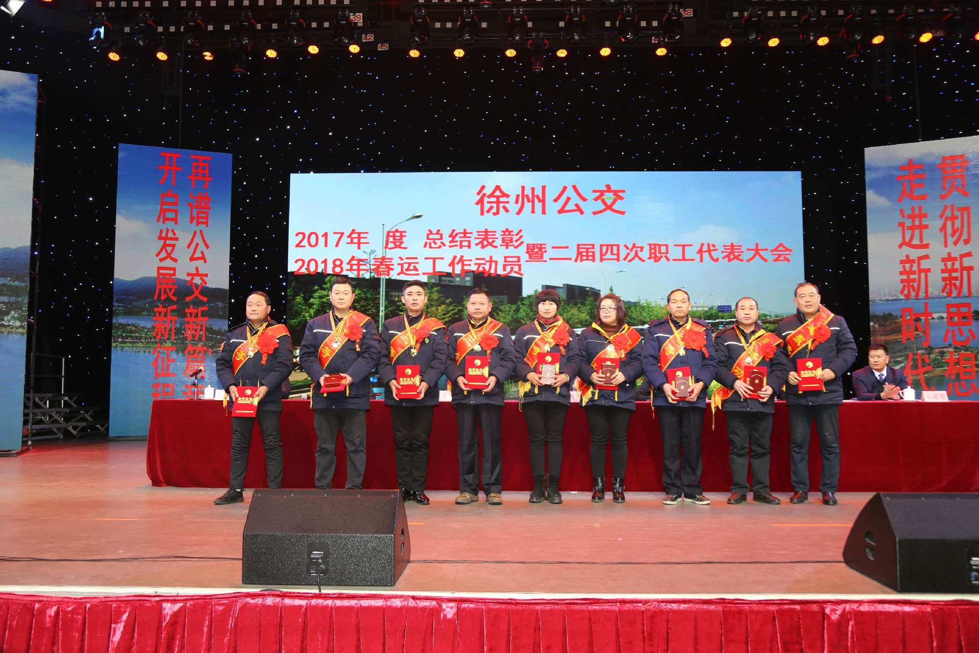 大會(huì)在莊嚴(yán)的國歌聲中拉開序幕。公司董事長、總經(jīng)理杜紅軍首先作經(jīng)理工作報(bào)告,對(duì)2017年“改革創(chuàng)新年”工作進(jìn)行了全面總結(jié):一、實(shí)施“同城同價(jià)”,優(yōu)化運(yùn)營管理,實(shí)現(xiàn)服務(wù)水平新突破。連續(xù)第五年面向全市征集線路線網(wǎng)優(yōu)化意見近3000條,據(jù)此新辟優(yōu)化線路29條。二、深化資源共享,在互聯(lián)網(wǎng)+企業(yè)管理上譜寫新藍(lán)圖。繼續(xù)深化集中維修,推行集中例檢。論證實(shí)施支付寶、微信、銀行卡閃付等智能化移動(dòng)支付方式。三、深化文明創(chuàng)建,打造優(yōu)秀公交,服務(wù)民生出行贏得新口碑。在國檢、省檢中未失一分,圓滿完成創(chuàng)建驗(yàn)收任務(wù)。投訴總數(shù)和有責(zé)投訴同比實(shí)現(xiàn)“雙下降”。乘客表揚(yáng)同比上升近20%。公司在2016年行風(fēng)熱線上線單位滿意度評(píng)議投票中名列榜首。率先打造公交行業(yè)禮讓斑馬線嶄新形象,圓滿完成公交反恐防暴工作。四、著力綜合管理,聚合內(nèi)生動(dòng)能,增強(qiáng)企業(yè)發(fā)展新優(yōu)勢(shì)。重新修訂2012版管理制度匯編和新版《徐州公交獎(jiǎng)懲條例》。五、踐行十九大精神,推進(jìn)和諧發(fā)展,開創(chuàng)黨群工作新面貌。接著,杜總分析了工作中存在的問題,提出下步工作重點(diǎn)。一、建設(shè)現(xiàn)代化公交,提升經(jīng)營管理水平,保障企業(yè)良性有序運(yùn)行;二、踐行集約共享理念,深化科技應(yīng)用,開創(chuàng)公交事業(yè)發(fā)展新局面;三、建設(shè)平安公交,提升服務(wù)口碑,展示文明公交新形象;四、踐行十九大精神,構(gòu)建和諧公交,開啟黨群工作新面貌。