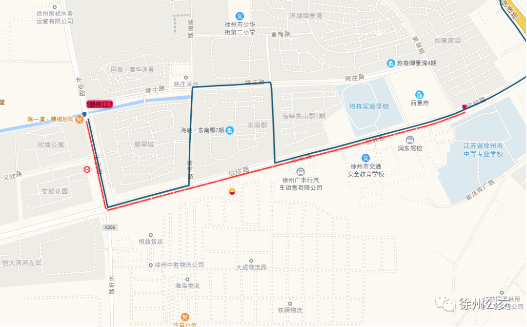 5路開往萬虹橋電子市場方向,由翡翠城發(fā)車后,經(jīng)長安路左轉(zhuǎn)進(jìn)入欣欣路。